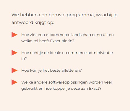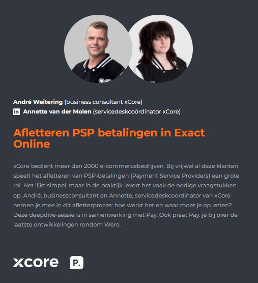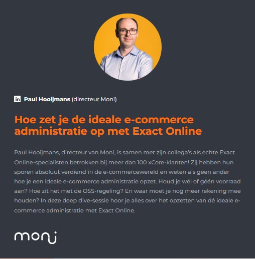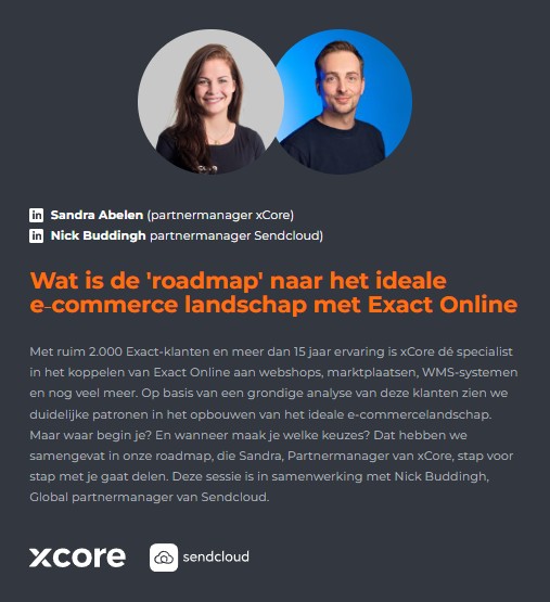 Deze bijzondere sessie, Exact Meets E-commerce, wordt georganiseerd door de Exact Online Vereniging én xCore en is nét even anders dan je wellicht gewend bent. Tijdens deze sessie word je meegenomen in de wereld van e-commerce. Met diepgaande sessies over het opzetten van de ideale Exact-administratie tot hoe je het beste kunt afletteren. Daarom is deze bijeenkomst exclusief bedoeld voor Exact Online-specialisten, accountancykantoren en administratiekantoren.