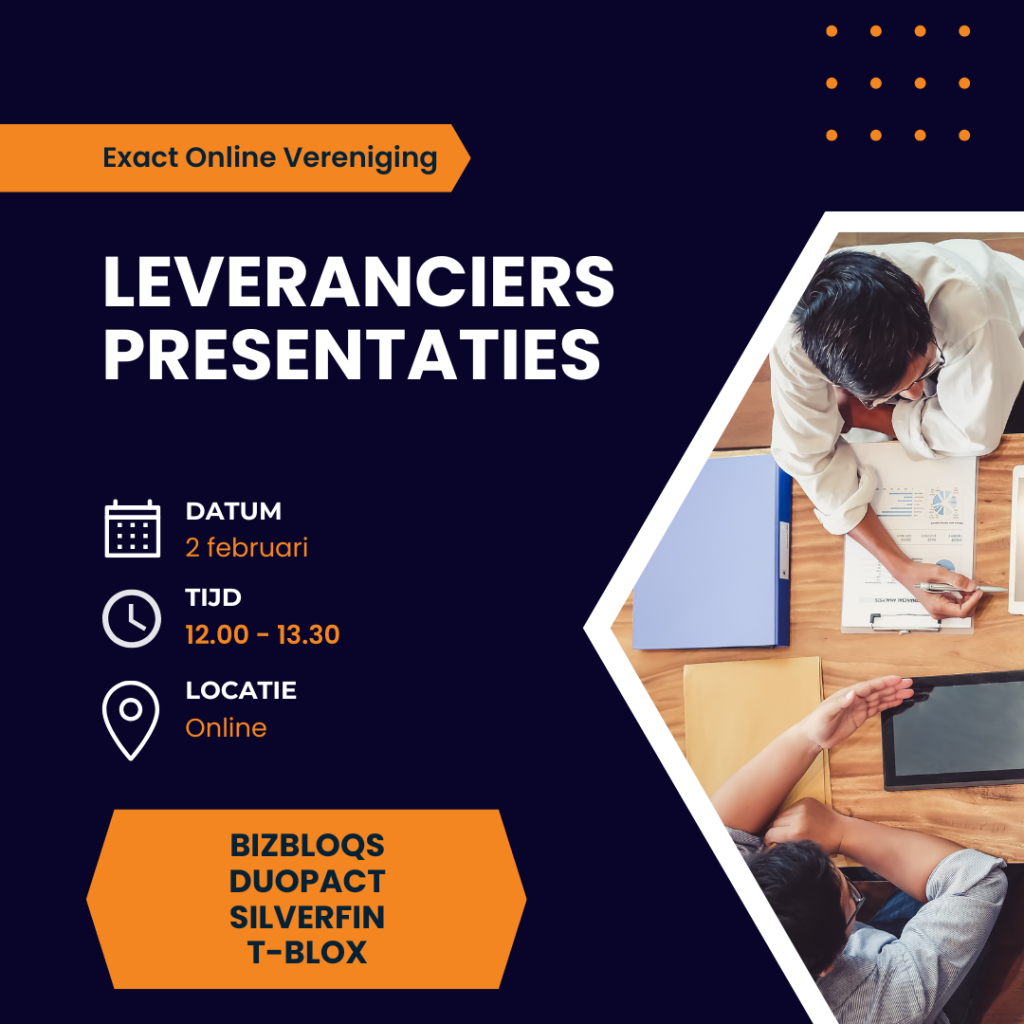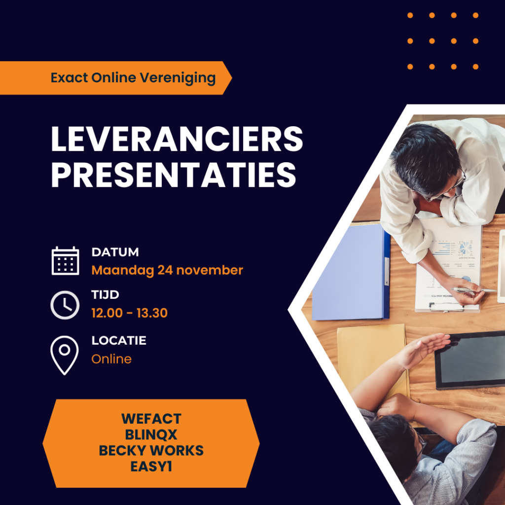 Exact online vereniging organiseert per jaar 3 live bijeenkomsten, 2 online bijeenkomsten voor verbeterpunten en 5 online bijeenkomst met een interessant onderwerp.